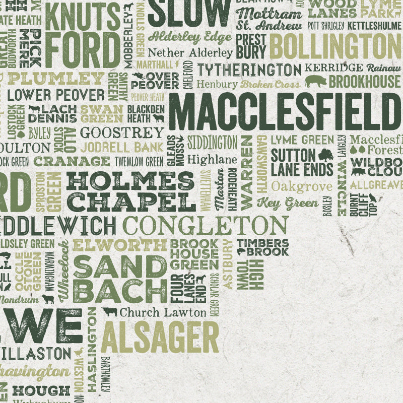 Celebrate your love for CHESHIRE with this beautiful typographic map. Whether you're from Chester, Crewe, Macclesfield, Warrington, Knutsford, Wilmslow, or Nantwich - this artwork captures the spirit of the county.