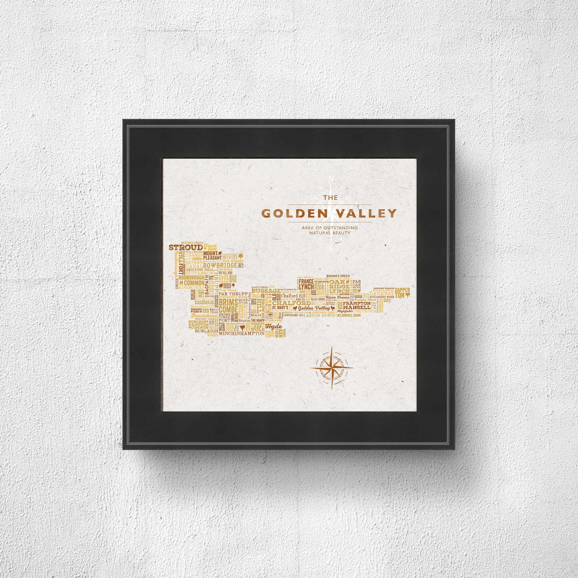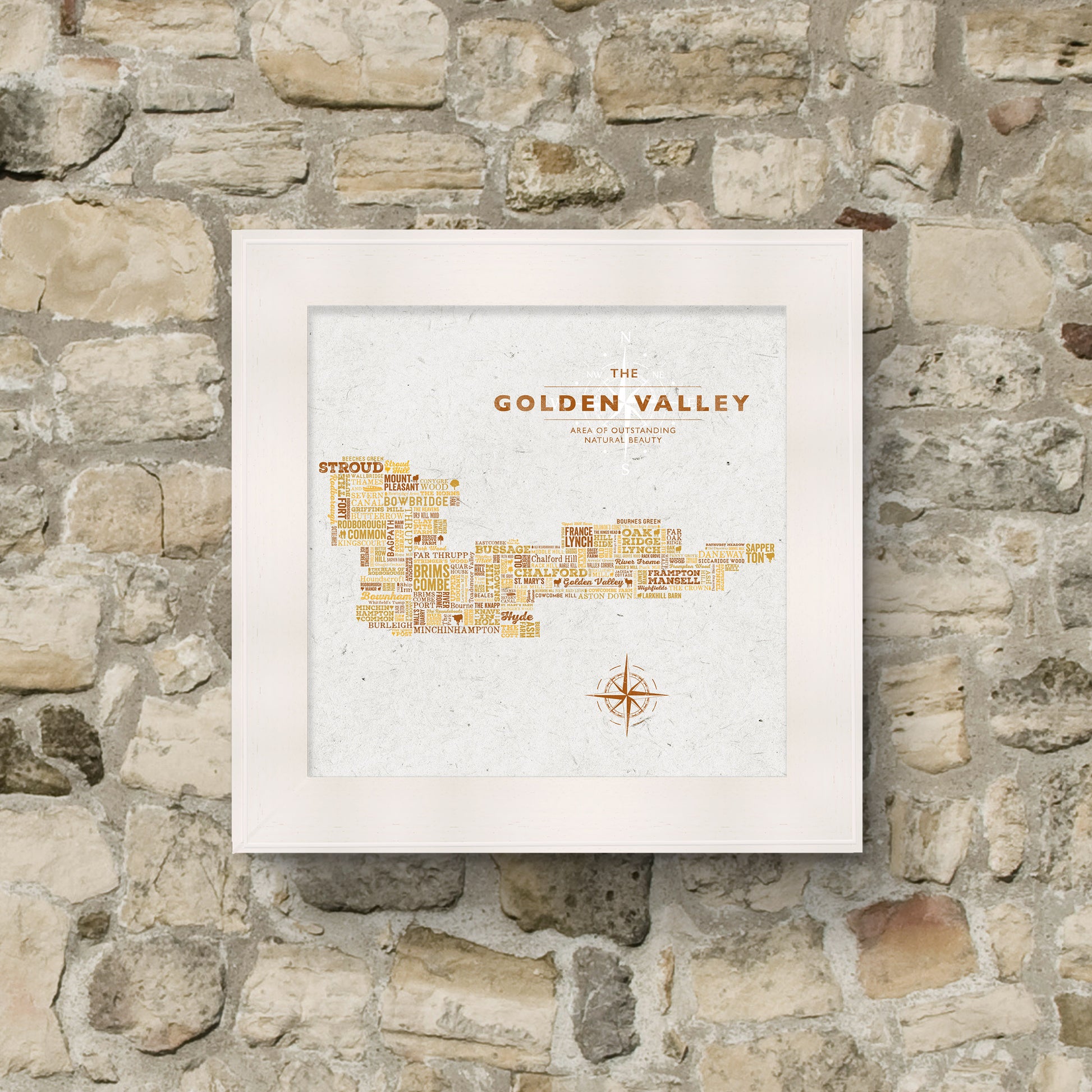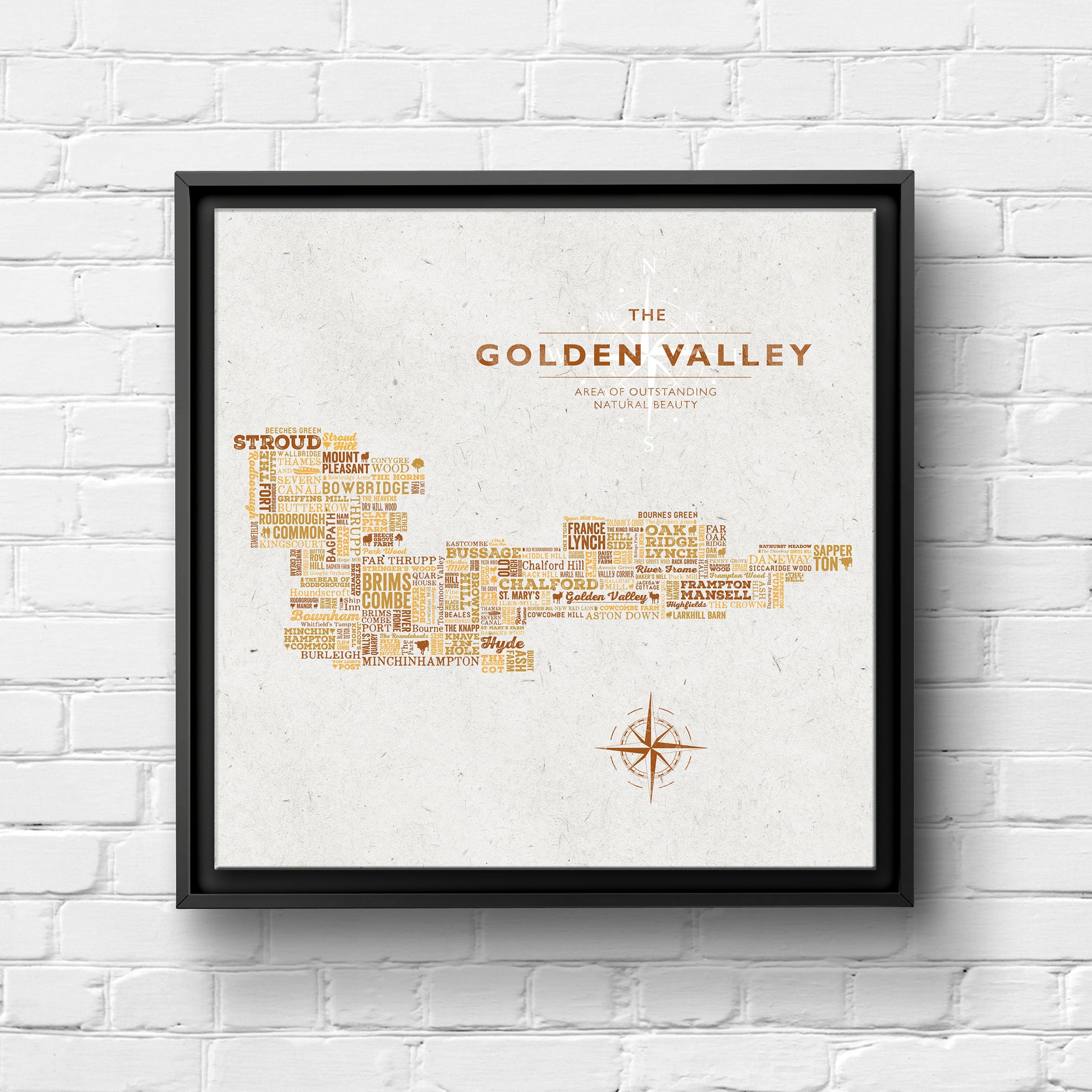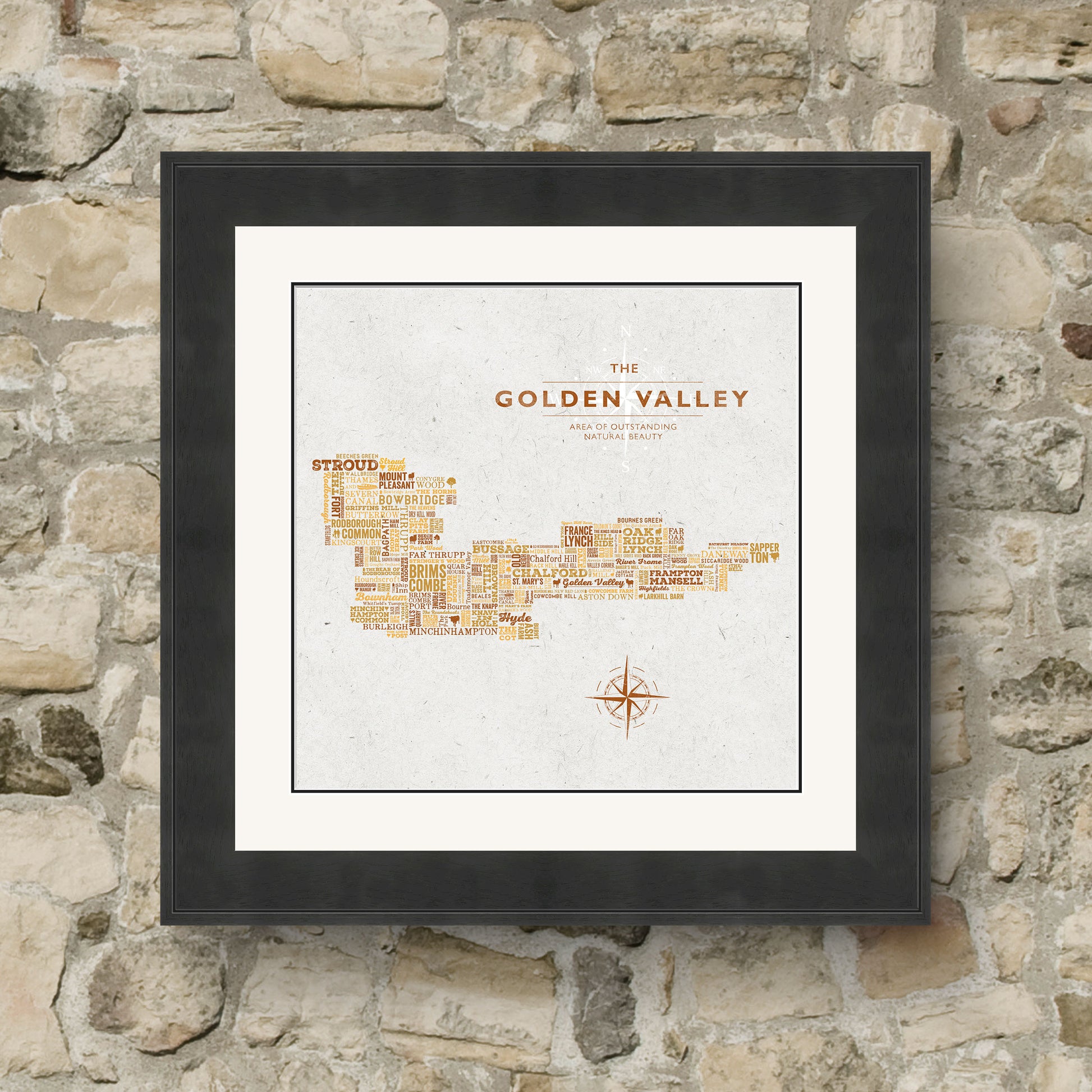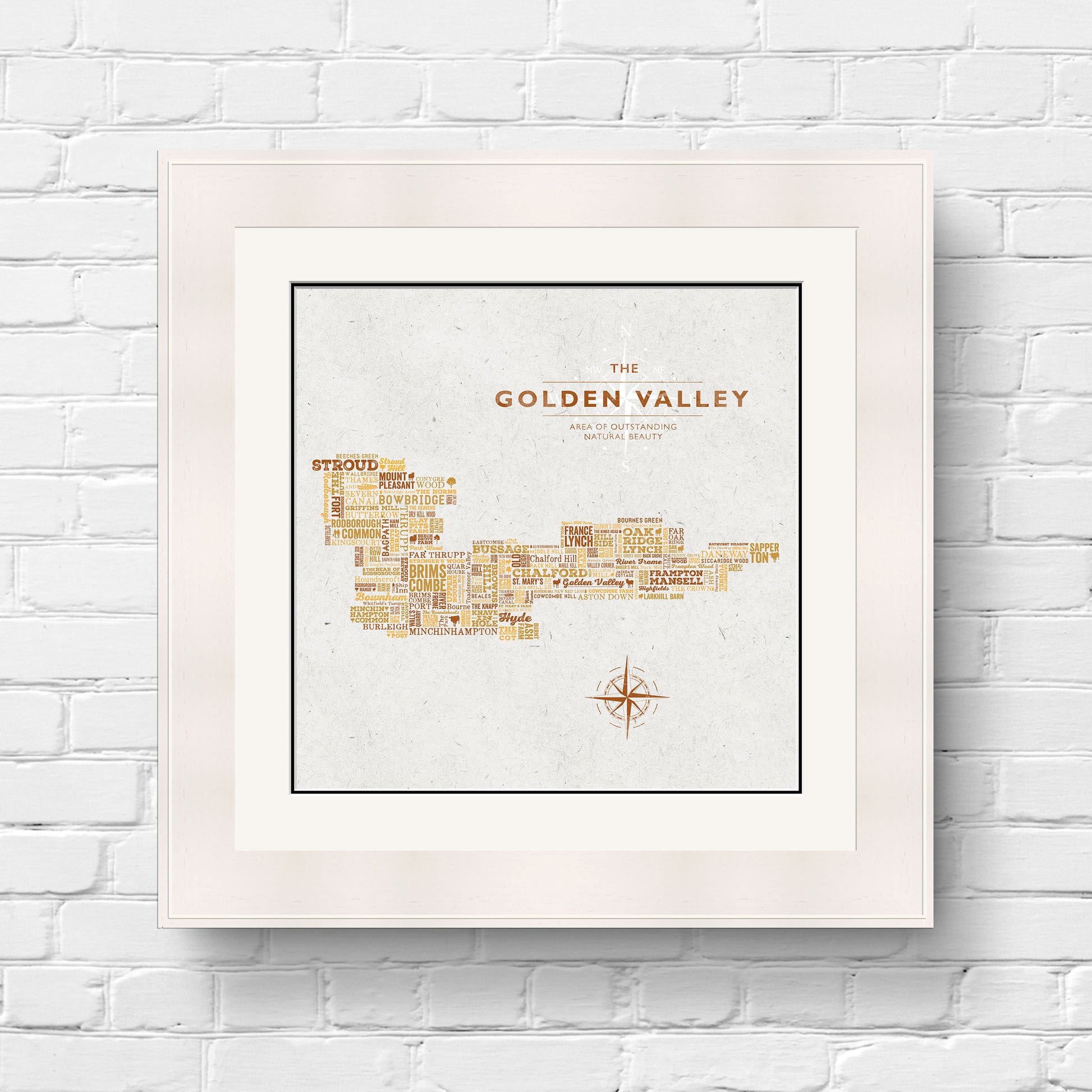 Celebrating the THE GOLDEN VALLEY, GLOUCESTERSHIRE WITHIN THE COTSWOLDS, AN AREA OF OUTSTANDING NATURAL BEAUTY The Golden Valley map is a perfect feature for your home, as a gift, or to celebrate a milestone or special event. Family, friends, colleagues… will love searching for their home town or village, where they were born, or got hitched and holidayed! Our beautifully created and detailed typographic designs are produced using high resolution giclée print on fine art paper or canvas. With a choice of frames, colour options and sizes, you can add that individual touch. When it’s ready, we’ll post it anywhere in the United Kingdom. FADED GRANDEUR / Designed and lovingly handmade in Great Britain