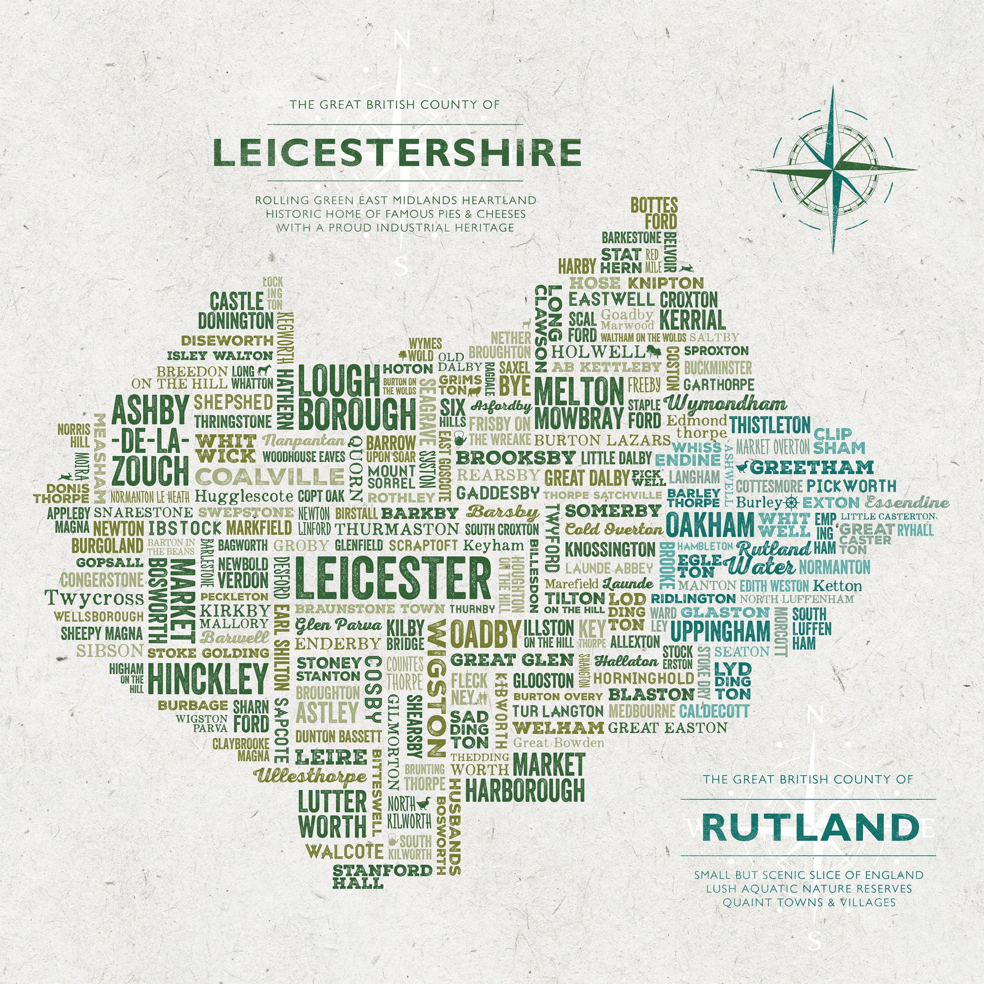 Celebrate your love for LEICESTERSHIRE with this beautiful typographic map. Whether you're from Leicester, Loughborough, Melton Mowbray, Market Harborough, Hinckley, Lutterworth, or Ashby-de-la-Zouch - this artwork captures the spirit of the county.